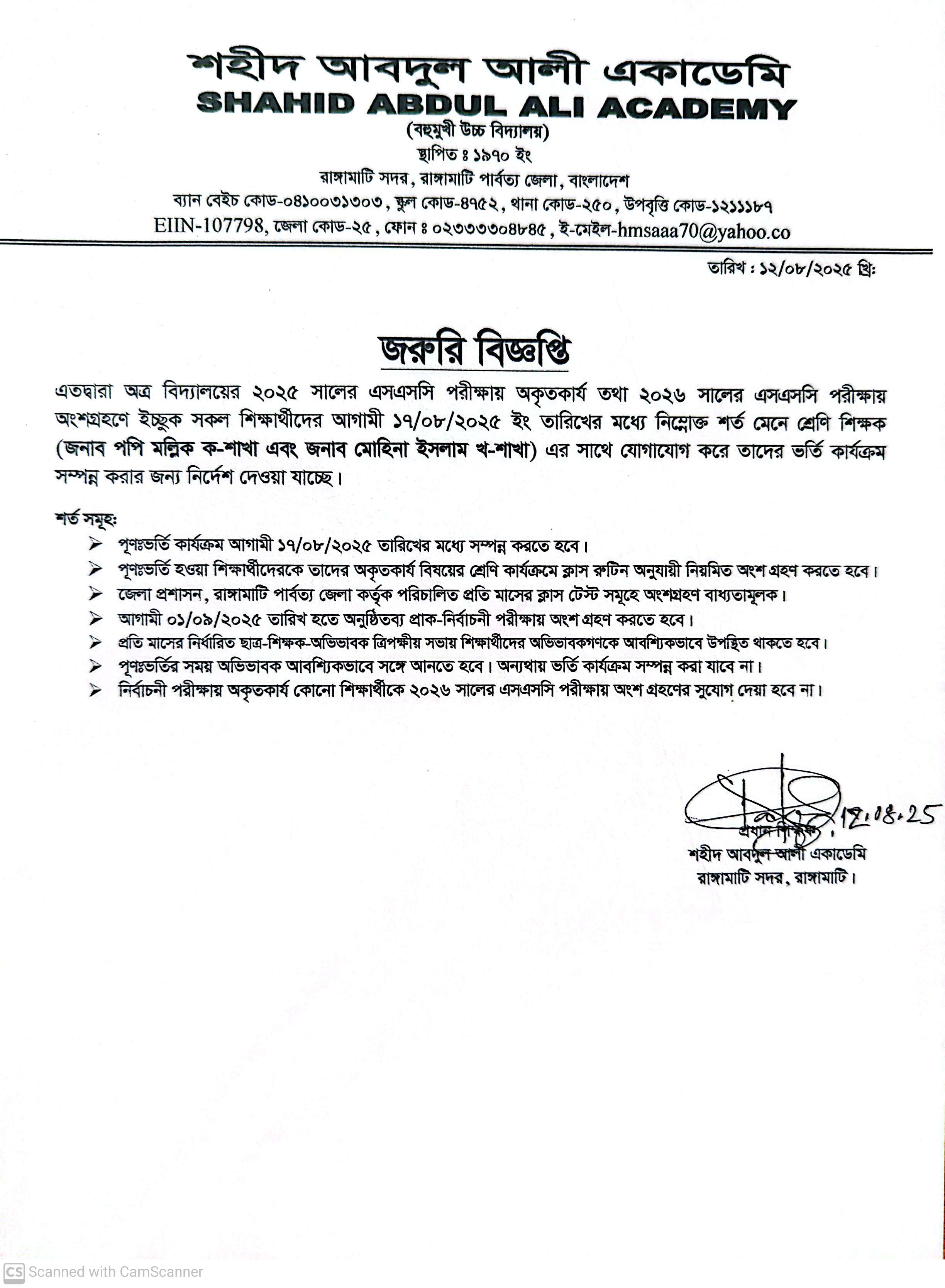 ২০২৫ সালে SSC তে অকৃতকার্য শিক্ষার্থীদের ২০২৬ সালের SSC পরীক্ষায় অংশগ্রহনেচ্ছুক শিক্ষার্থীদের পুনঃভর্তি নোটিশ
